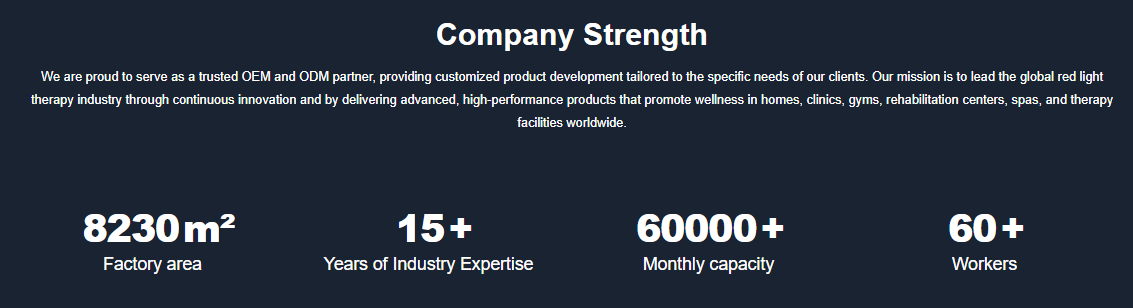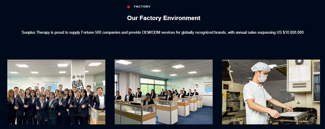 Sunplus Therapy is a trusted red light therapy device manufacturer and long-term OEM partner for Fortune 500 companies and leading global brands. Specializing in high-performance therapy panels and customized wellness solutions, we combine advanced photobiomodulation technology with scalable production capabilities.With a vertically integrated factory and a proven track record in OEM/ODM development, we offer full-spectrum red and near-infrared light therapy devices that meet international standards, including FDA, ETL, CE, ISO13485, and more. Our expertise lies in delivering tailor-made solutions—from wavelength and power configuration to smart control systems—helping our partners bring innovative health and beauty products to market quickly and reliably.